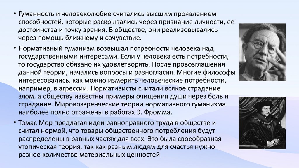 • Гуманность и человеколюбие считались высшим проявлениемспособностей, которые раскрывались через признание личности, ее