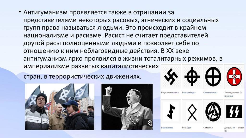 • Антигуманизм проявляется также в отрицании запредставителями некоторых расовых, этнических и социальных