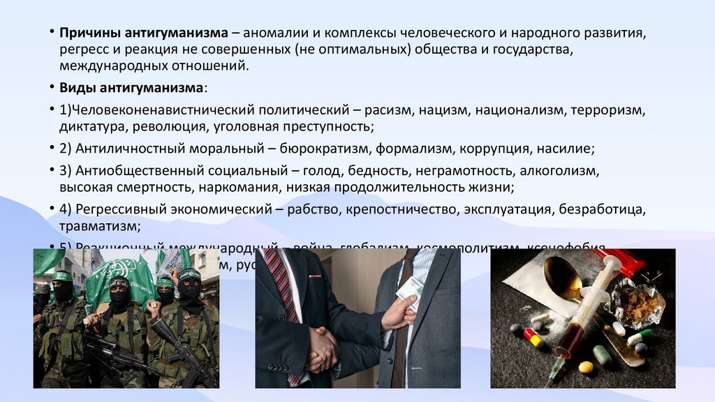 • Причины антигуманизма – аномалии и комплексы человеческого и народного развития,регресс и реакция не совершенных (не оптимальных) общества и государства,