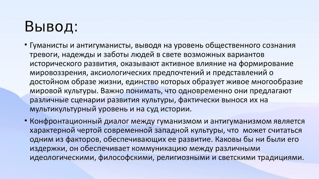 Вывод:• Гуманисты и антигуманисты, выводя на уровень общественного сознания
