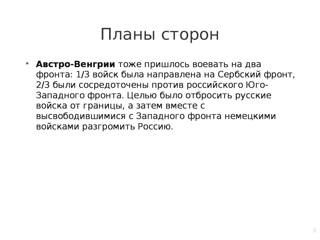 2/3 были сосредоточены против российского ЮгоЗападного фронта. Целью было отбросить русские