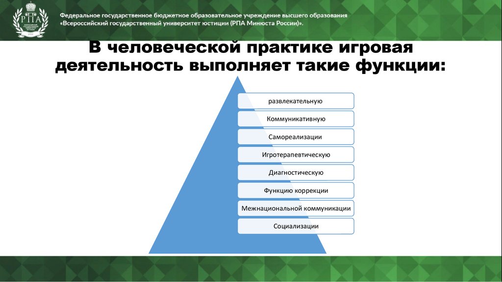 В человеческой практике игроваядеятельность выполняет такие функции: