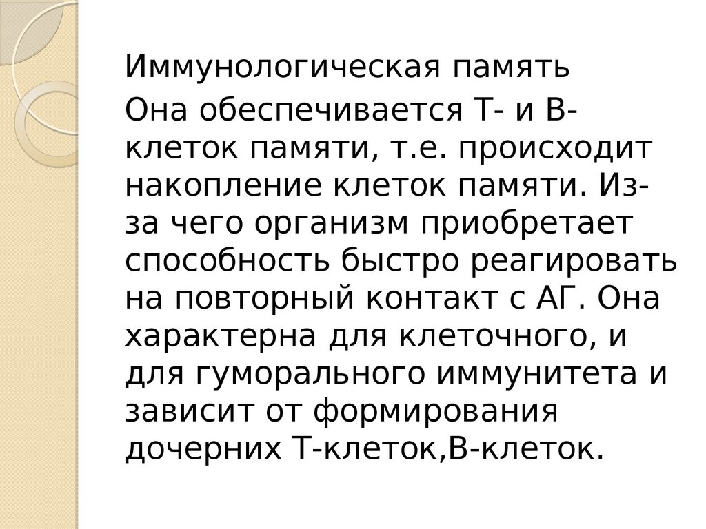 Иммунологическая памятьОна обеспечивается Т- и Вклеток памяти, т.е. происходит