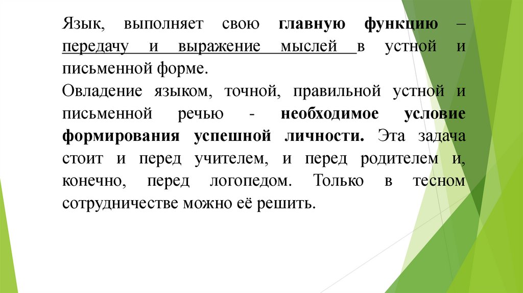 Язык, выполняет свою главную функцию –передачу и выражение мыслей в устной и