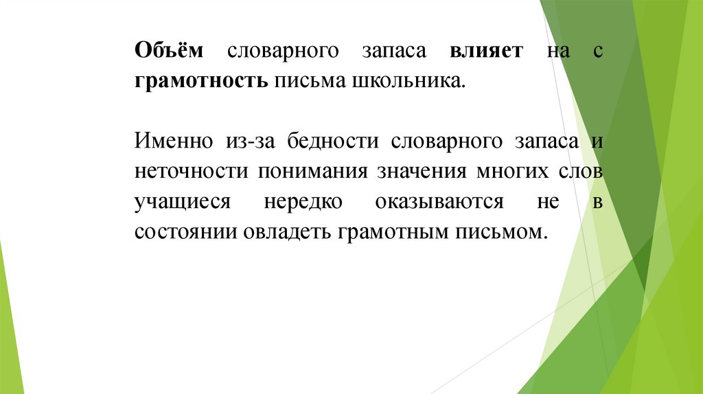 Объём словарного запаса влияет на сграмотность письма школьника.