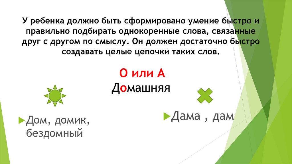 У ребенка должно быть сформировано умение быстро иправильно подбирать однокоренные слова, связанные