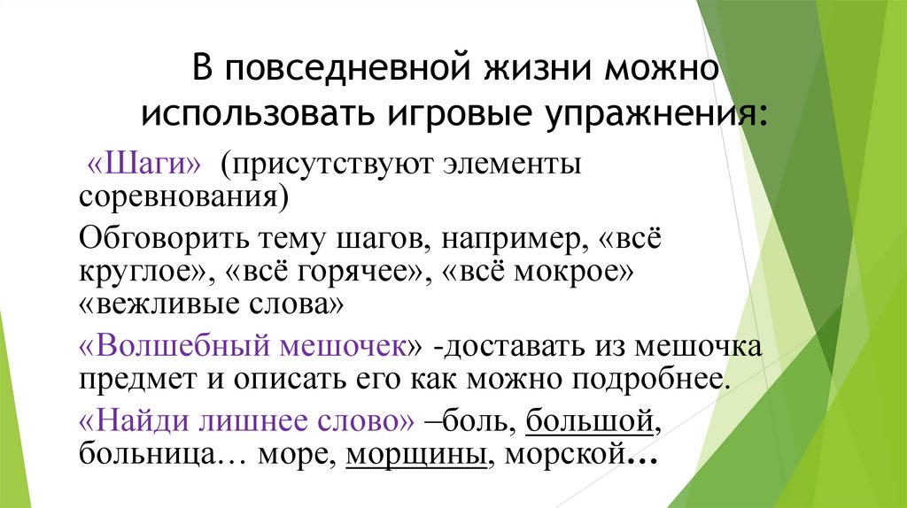 В повседневной жизни можноиспользовать игровые упражнения: