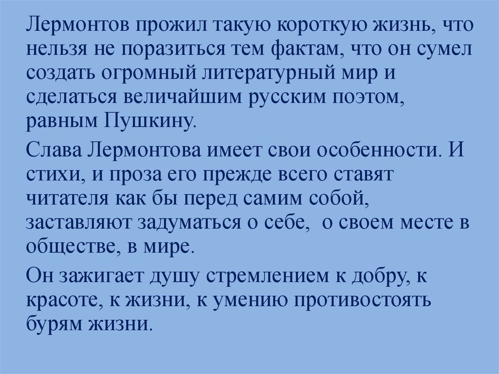 Лермонтов прожил такую короткую жизнь, чтонельзя не поразиться тем фактам, что он сумел