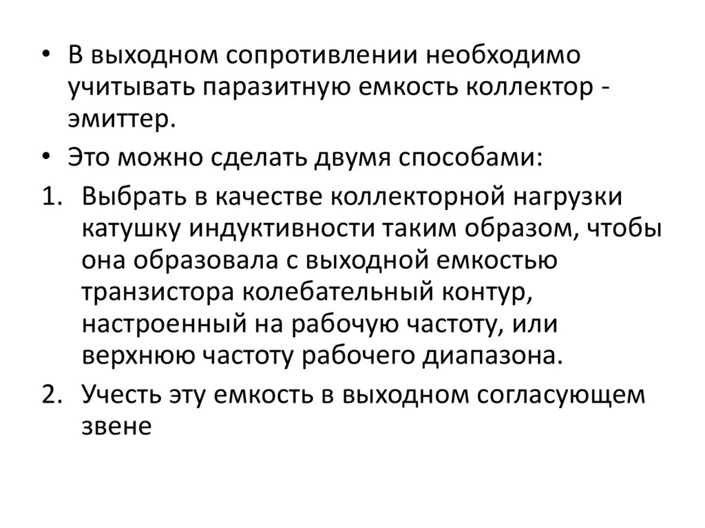 • В выходном сопротивлении необходимоучитывать паразитную емкость коллектор эмиттер.