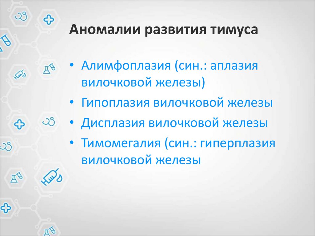Аномалии развития тимуса• Алимфоплазия (син.: аплазия