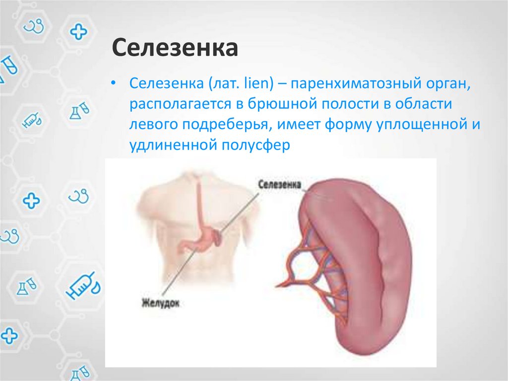 Селезенка• Селезенка (лат. lien) – паренхиматозный орган,