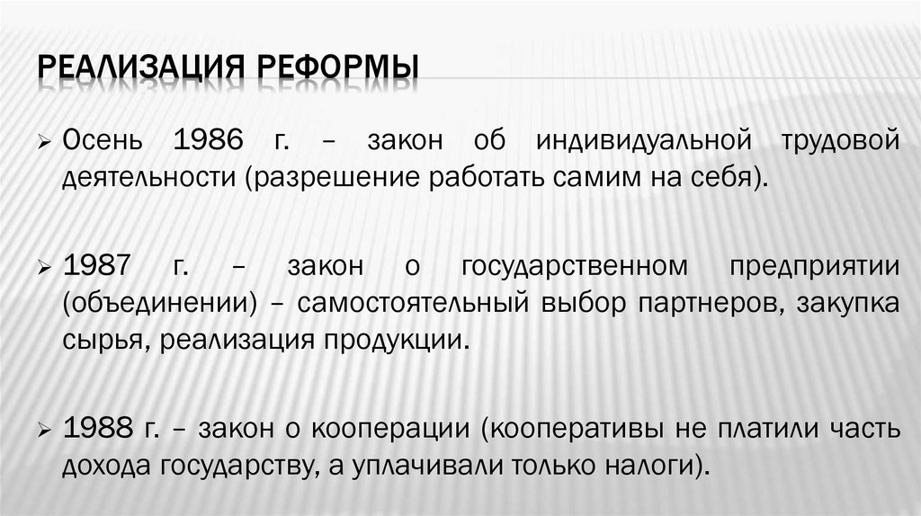РЕАЛИЗАЦИЯ РЕФОРМЫОсень 1986 г. – закон об индивидуальной трудовой