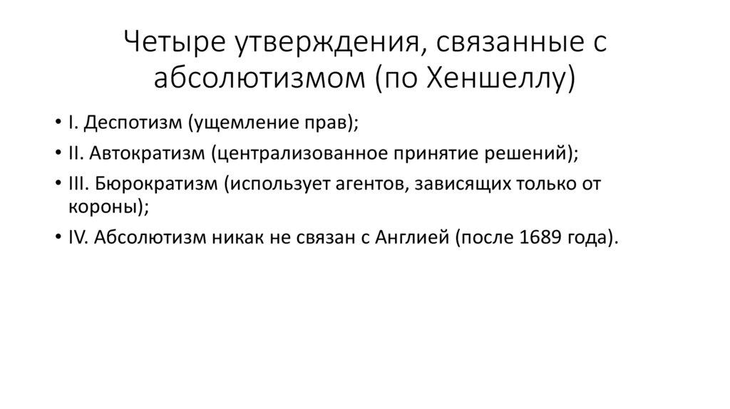 • IV. Абсолютизм никак не связан с Англией (после 1689 года).