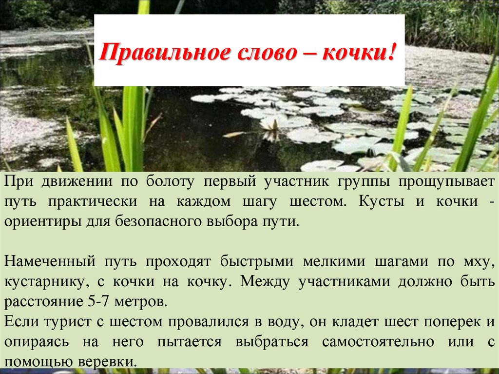 Правильное слово – кочки!При движении по болоту первый участник группы прощупывает