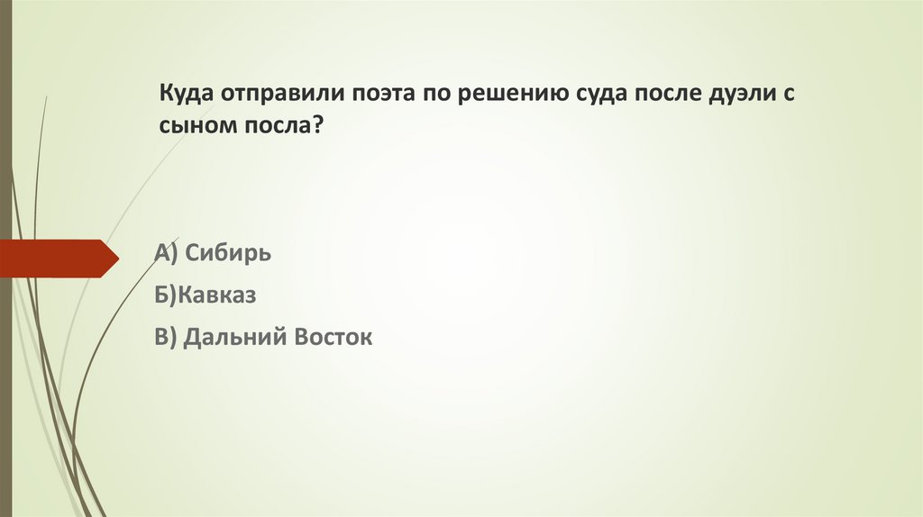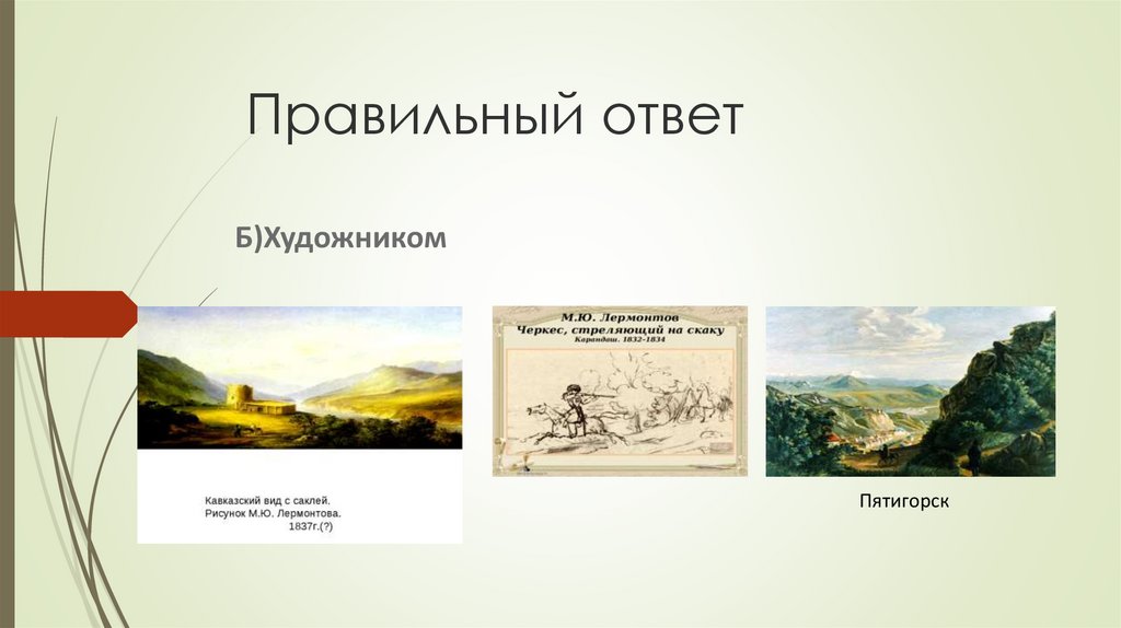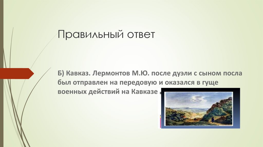 Правильный ответБ) Кавказ. Лермонтов М.Ю. после дуэли с сыном посла
