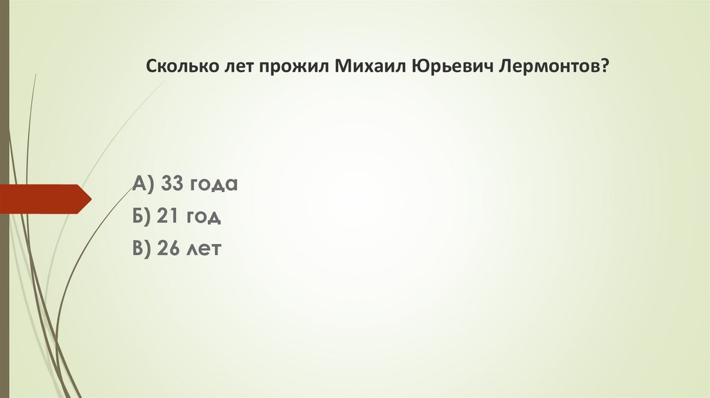 Сколько лет прожил Михаил Юрьевич Лермонтов?А) 33 года