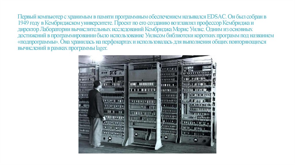 Первый компьютер с хранимым в памяти программным обеспечением назывался EDSAC. Он был собран в1949 году в Кембриджском университете. Проект по его созданию возглавлял профессор Кембриджа и