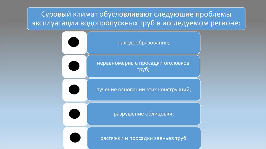 Суровый климат обусловливают следующие проблемыэксплуатации водопропускных труб в исследуемом регионе: