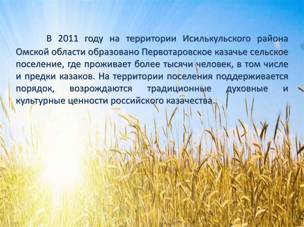 В 2011 году на территории Исилькульского районаОмской области образовано Первотаровское казачье сельское