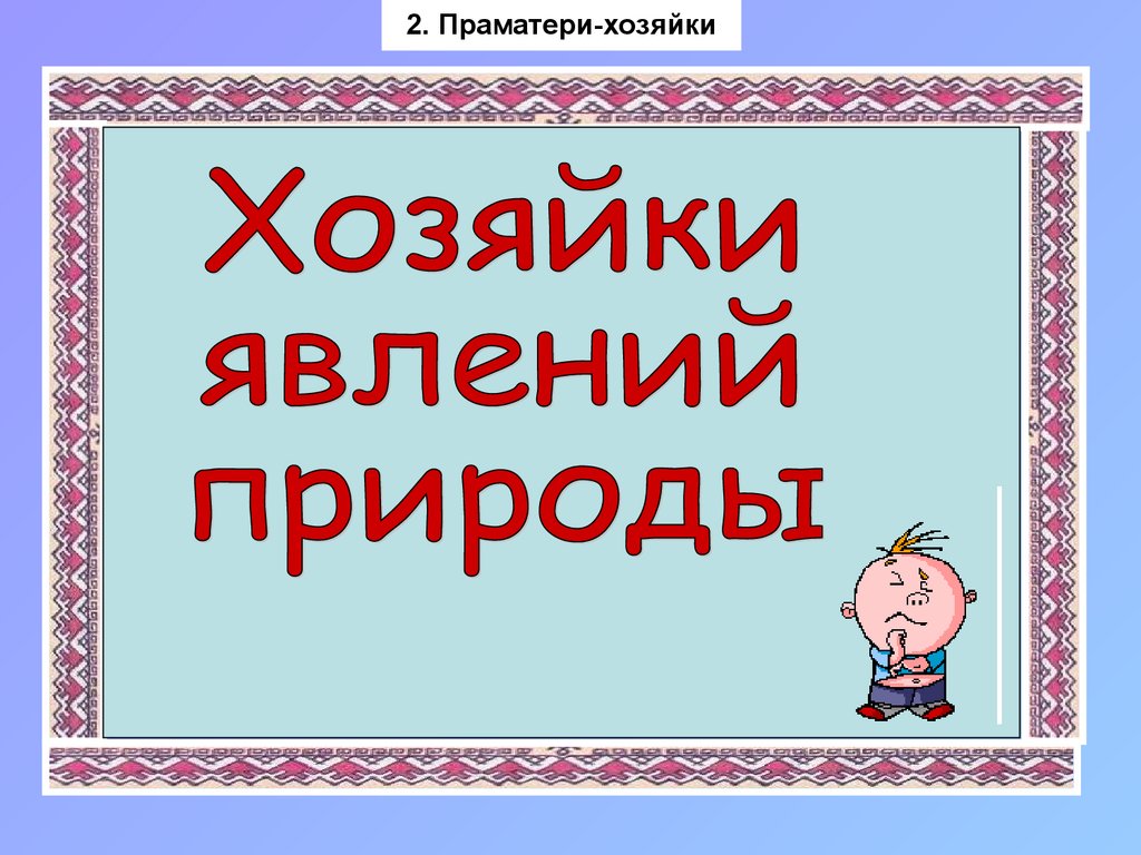 1.Сотворение мира (§ 5. п.1)2. Богини-хозяйки(п.2)