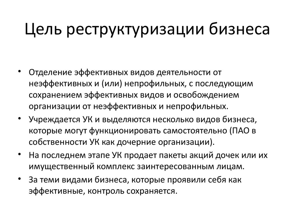 • Поясните сущность и полезный эффект при реструктуризации бизнеса