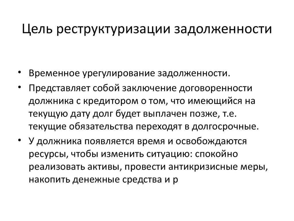 Цель реструктуризации задолженности• Временное урегулирование задолженности.