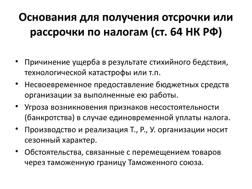 Основания для получения отсрочки илирассрочки по налогам (ст. 64 НК РФ)