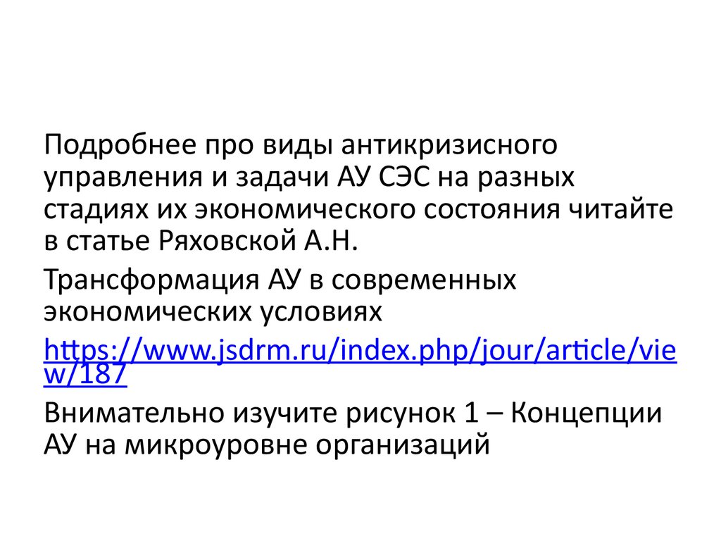 Подробнее про виды антикризисногоуправления и задачи АУ СЭС на разных