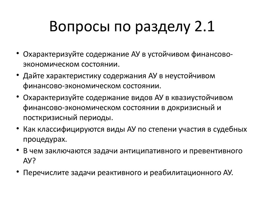 Вопросы по разделу 2.1• Охарактеризуйте содержание АУ в устойчивом финансовоэкономическом состоянии.