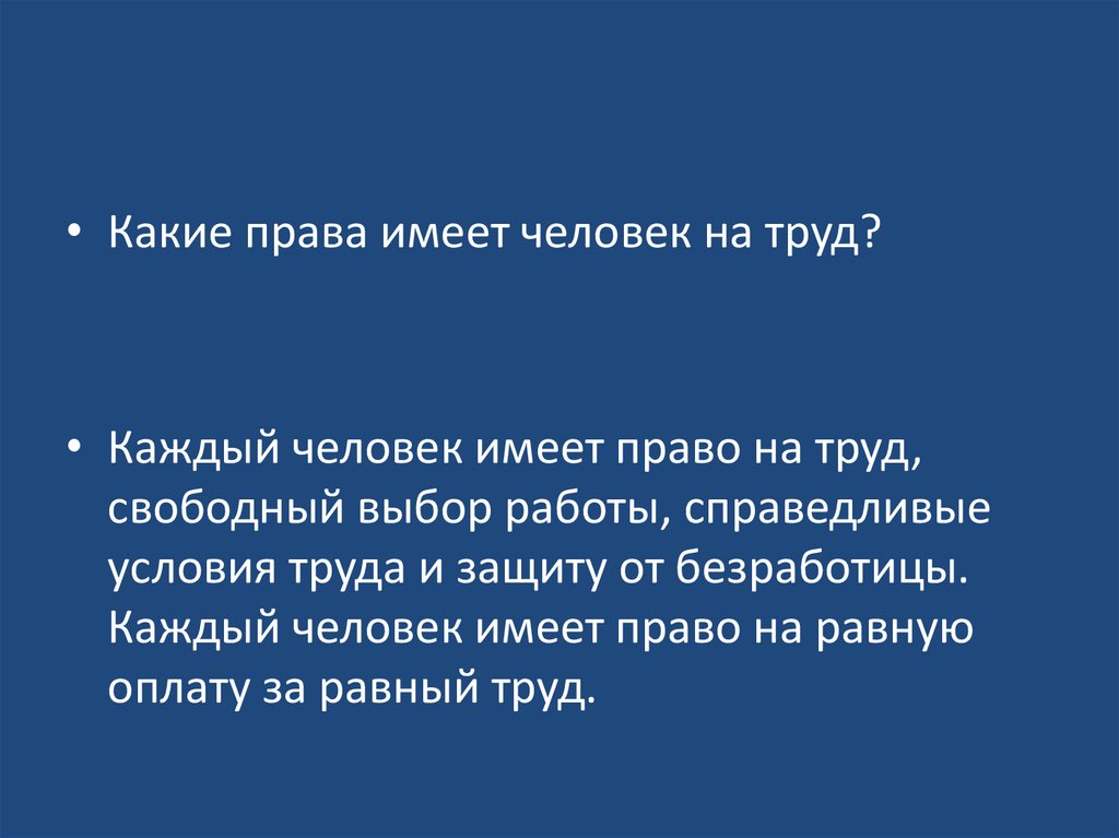 • Какие права имеет человек на труд?• Каждый человек имеет право на труд,