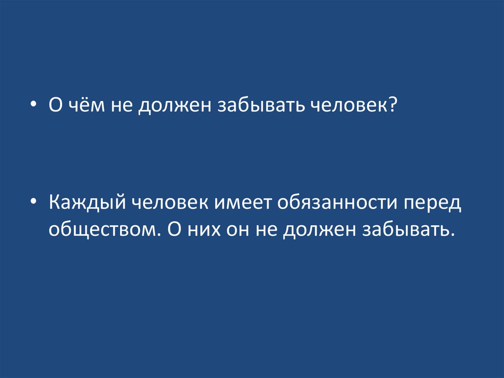 • О чём не должен забывать человек?• Каждый человек имеет обязанности перед