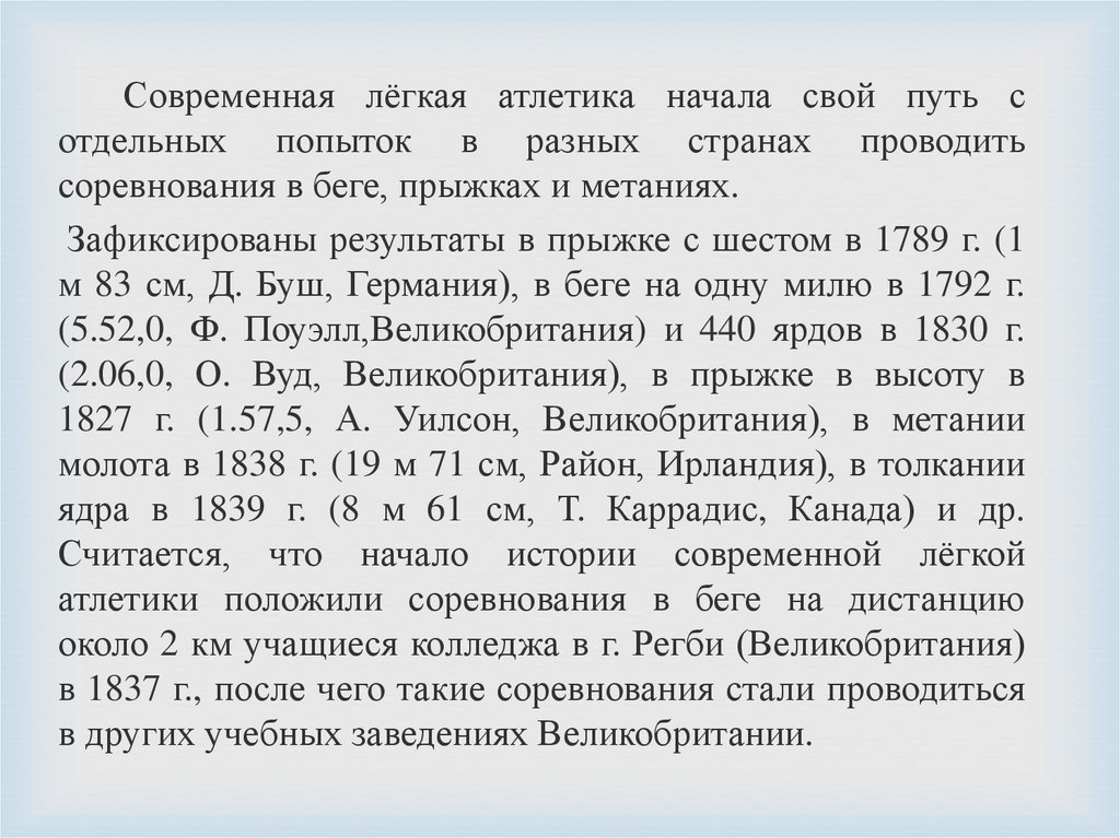 Современная лёгкая атлетика начала свой путь сотдельных попыток в разных странах проводить