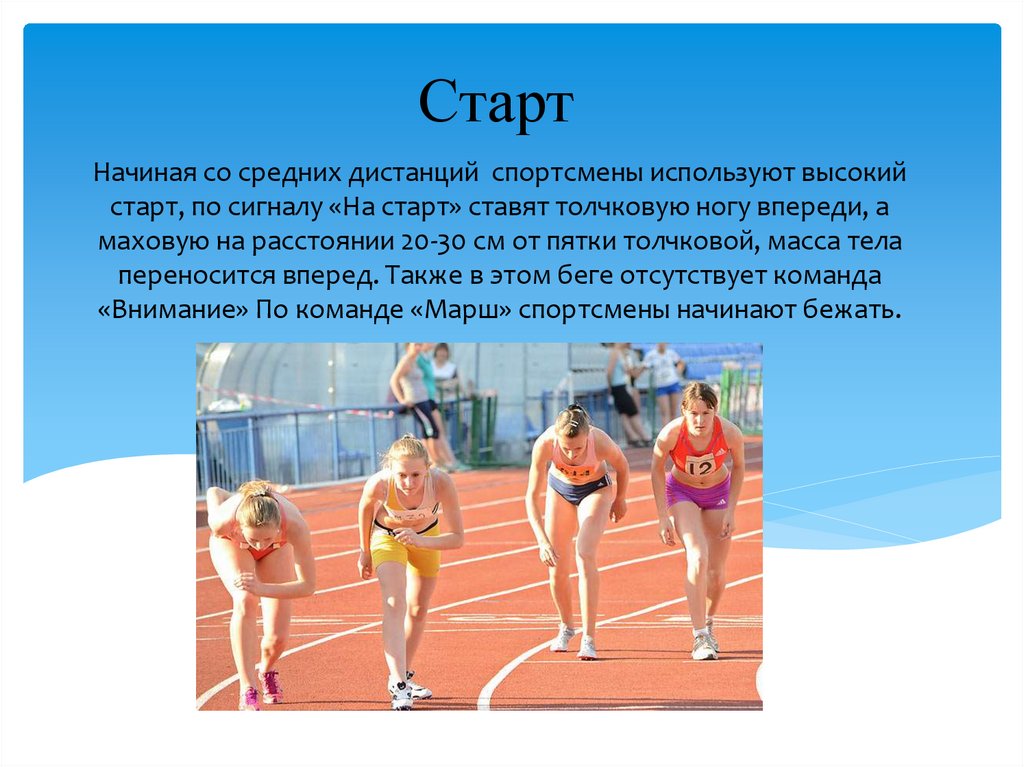 СтартНачиная со средних дистанций спортсмены используют высокий