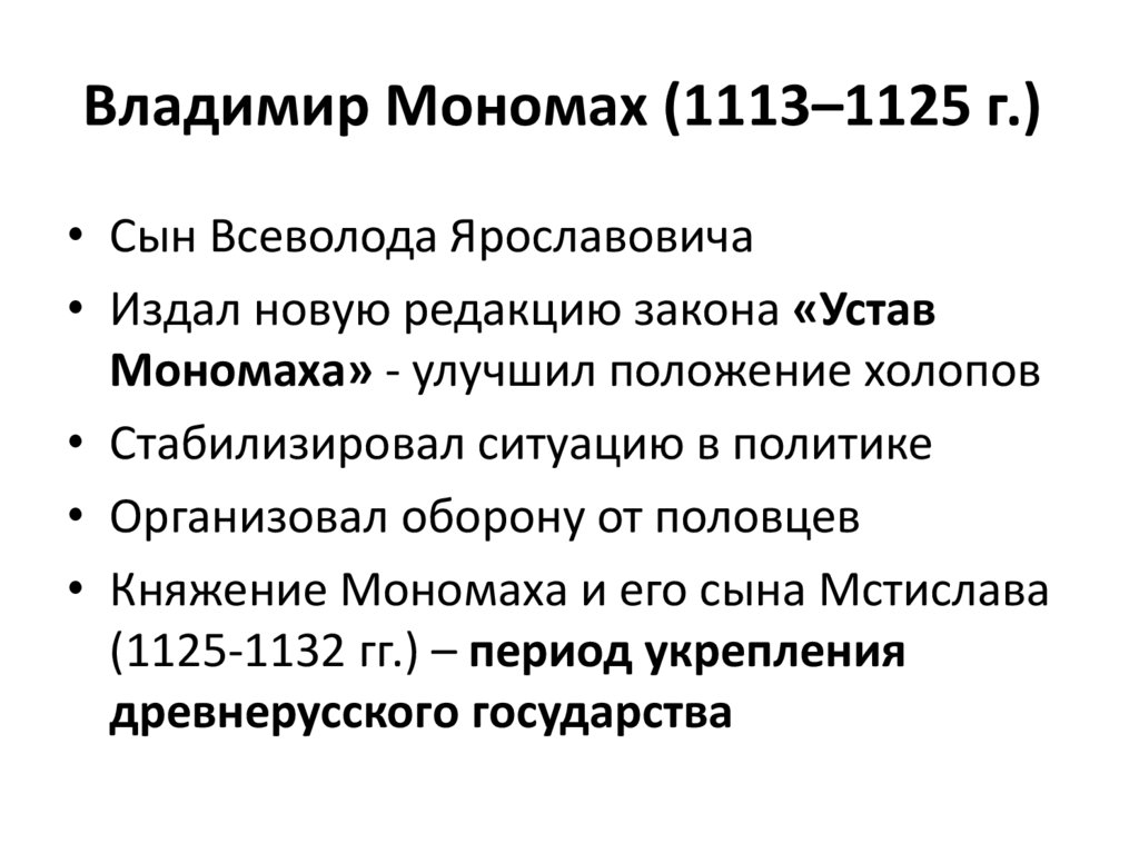 Владимир Мономах (1113–1125 г.)• Сын Всеволода Ярославовича