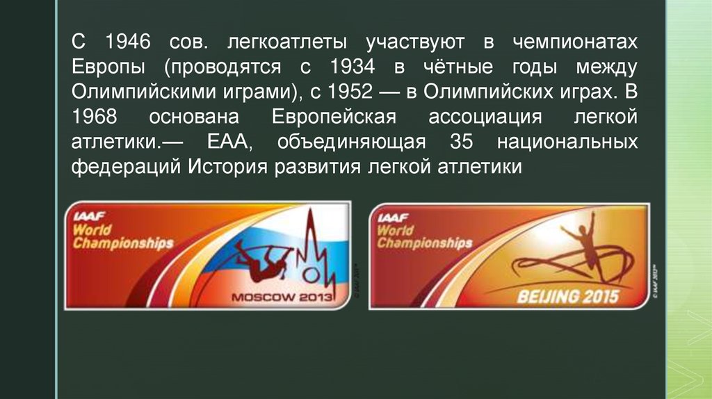С 1946 сов. легкоатлеты участвуют в чемпионатахЕвропы (проводятся с 1934 в чётные годы между