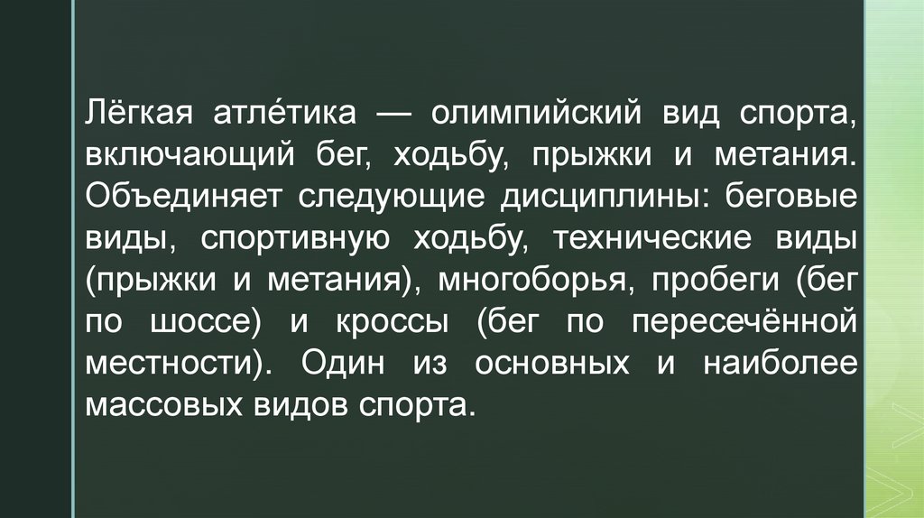 Лёгкая атле́тика — олимпийский вид спорта,включающий бег, ходьбу, прыжки и метания.