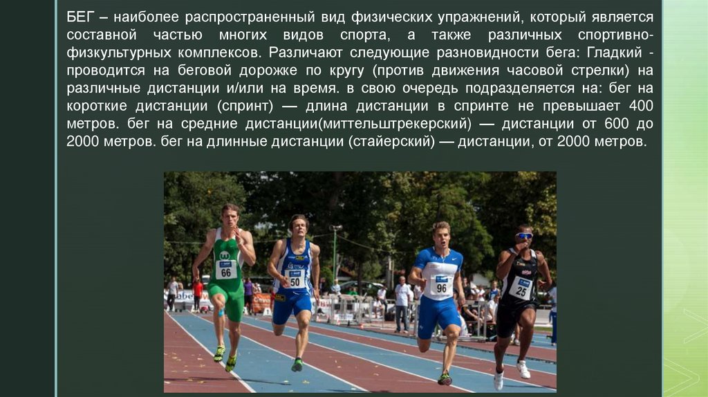 БЕГ – наиболее распространенный вид физических упражнений, который являетсясоставной частью многих видов спорта, а также различных спортивнофизкультурных комплексов. Различают следующие разновидности бега: Гладкий проводится на беговой дорожке по кругу (против движения часовой стрелки) на