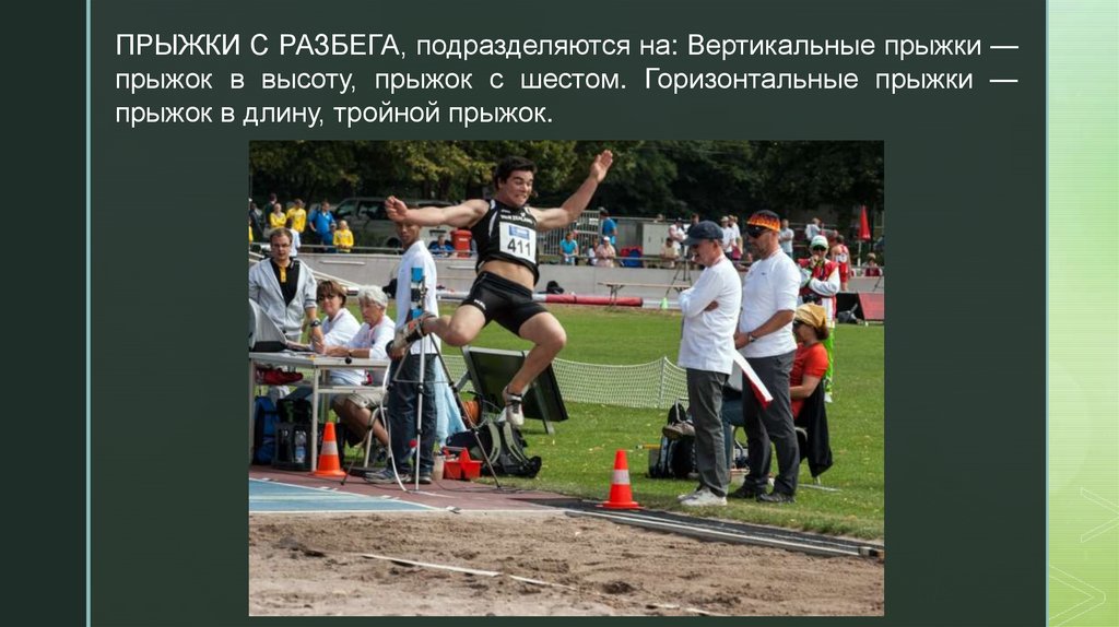 ПРЫЖКИ С РАЗБЕГА, подразделяются на: Вертикальные прыжки —прыжок в высоту, прыжок с шестом. Горизонтальные прыжки —