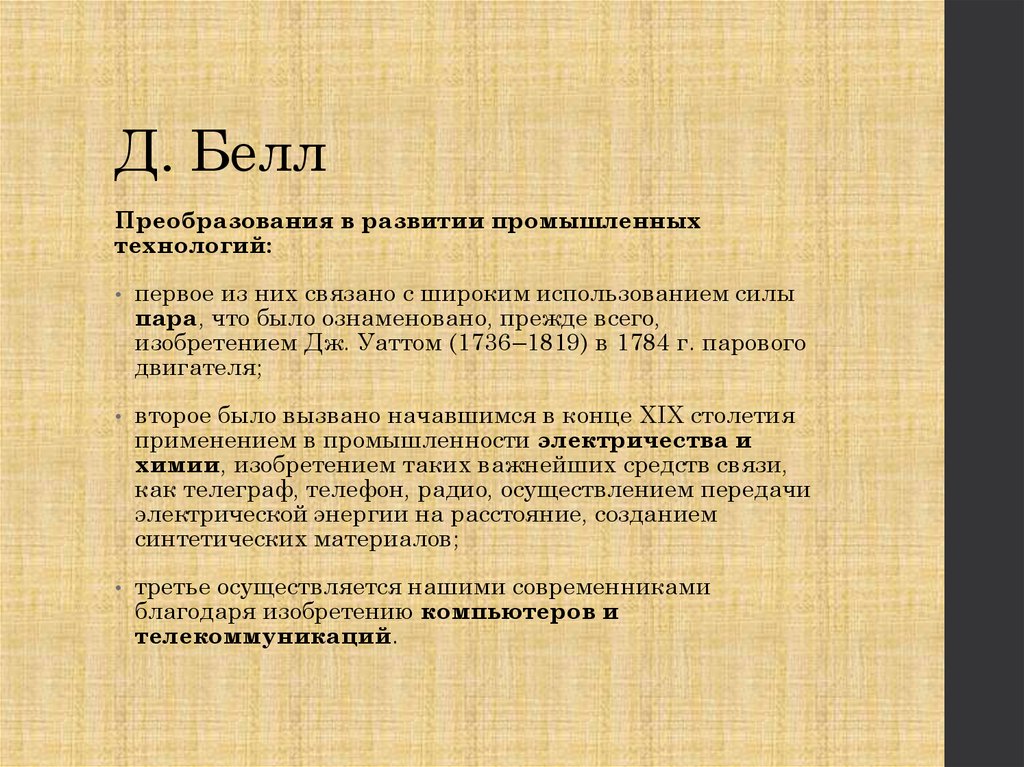 техники. Главным в таком производстве, по мнению Д. Белла, является