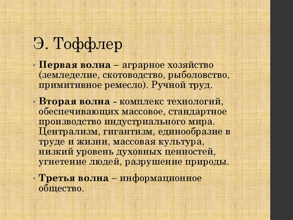 Э. ТоффлерПервая волна – аграрное хозяйство