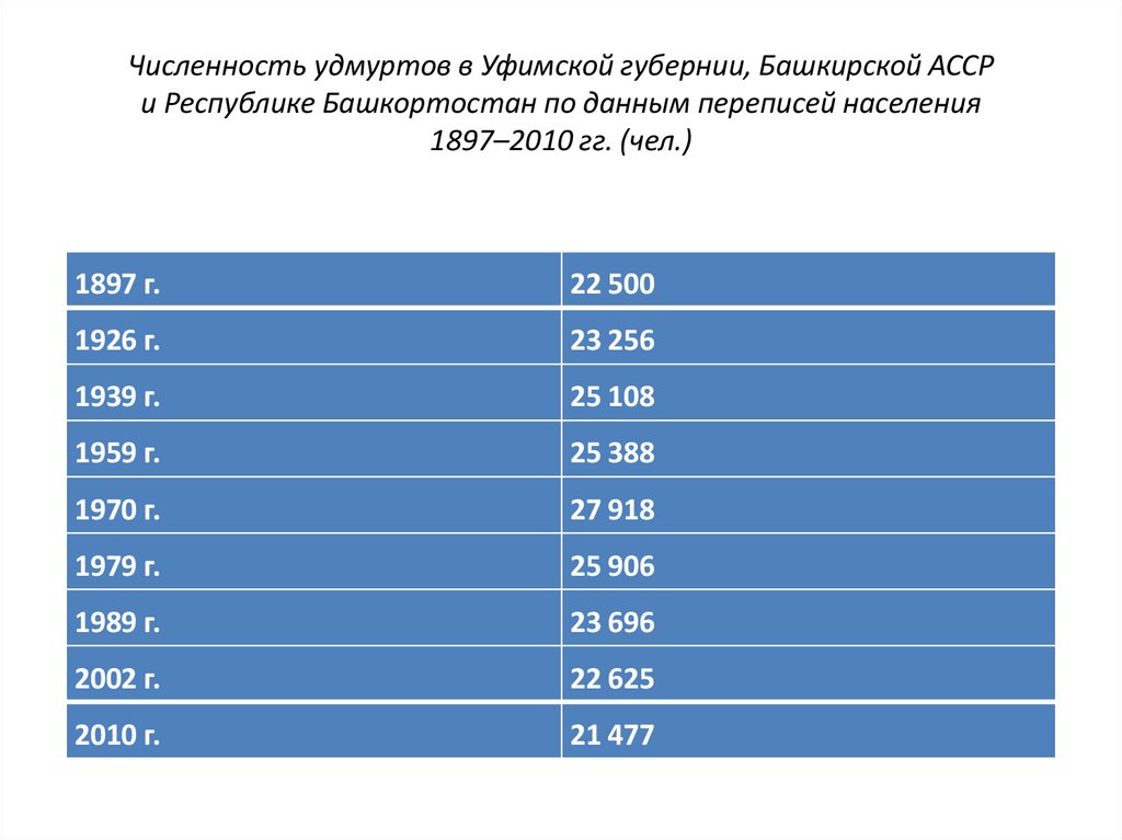 Численность удмуртов в Уфимской губернии, Башкирской АССРи Республике Башкортостан по данным переписей населения