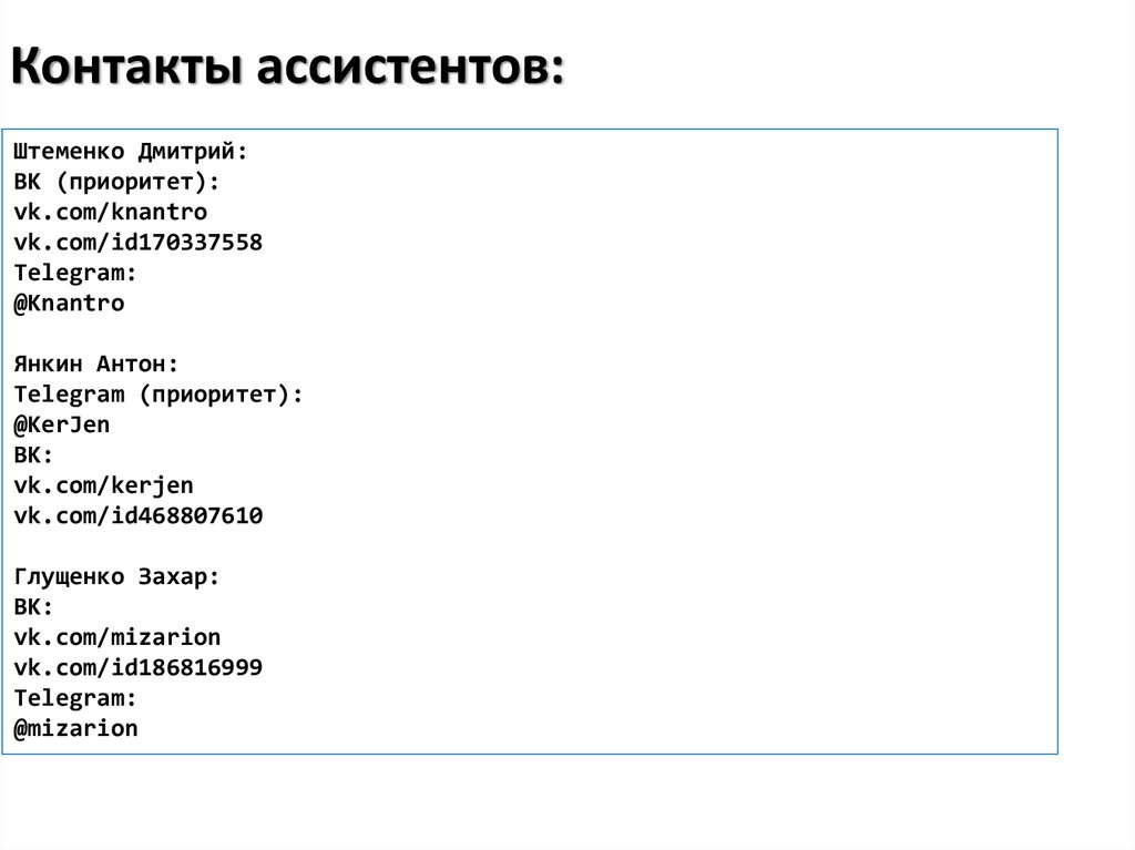Контакты ассистентов:Штеменко Дмитрий: