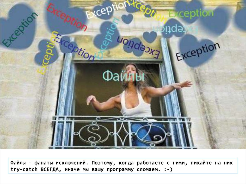 Файлы – фанаты исключений. Поэтому, когда работаете с ними, пихайте на нихtry-catch ВСЕГДА, иначе мы вашу программу сломаем. :-)