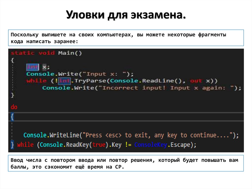 Уловки для экзамена.Поскольку выпишете на своих компьютерах, вы можете некоторые фрагменты