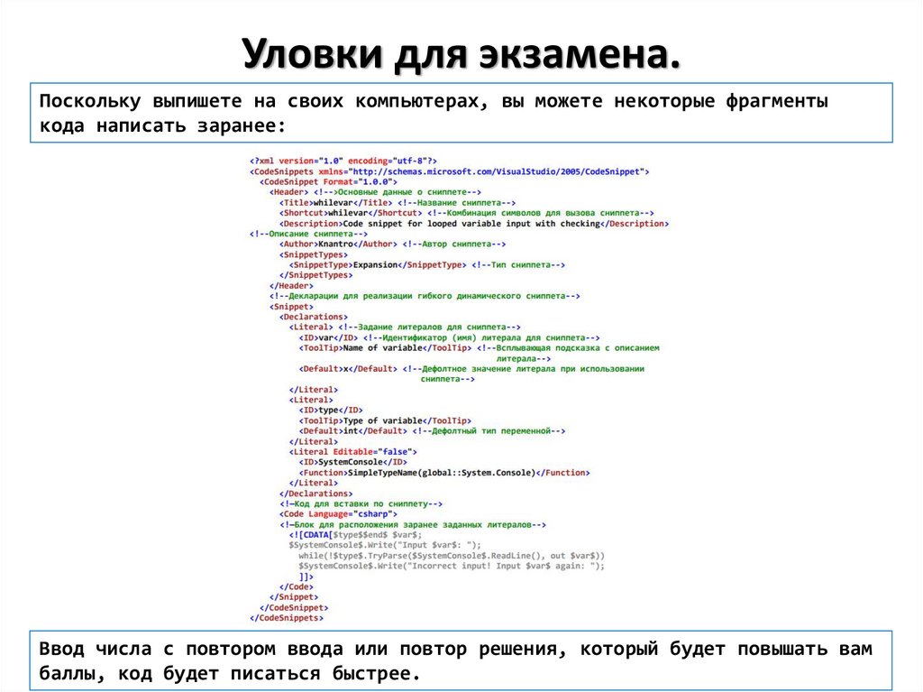 Уловки для экзамена.Можно ускорить немного написание кода, если использовать СНИППЕТЫ.
