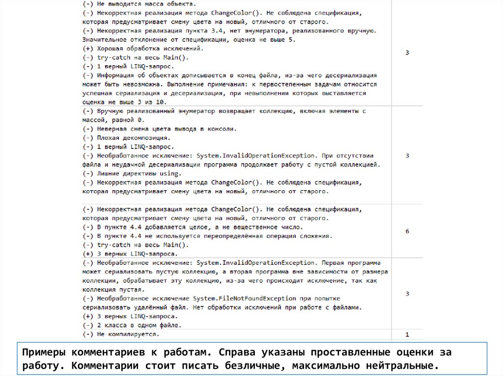 Примеры комментариев к работам. Справа указаны проставленные оценки заработу. Комментарии стоит писать безличные, максимально нейтральные.