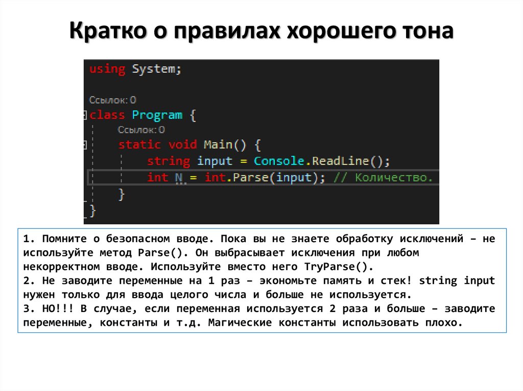 Кратко о правилах хорошего тона1. Помните о безопасном вводе. Пока вы не знаете обработку исключений – не