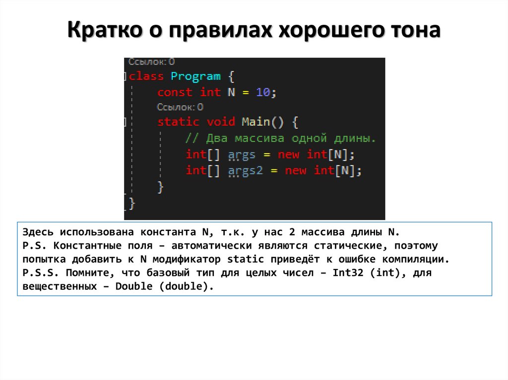 Кратко о правилах хорошего тонаЗдесь использована константа N, т.к. у нас 2 массива длины N.