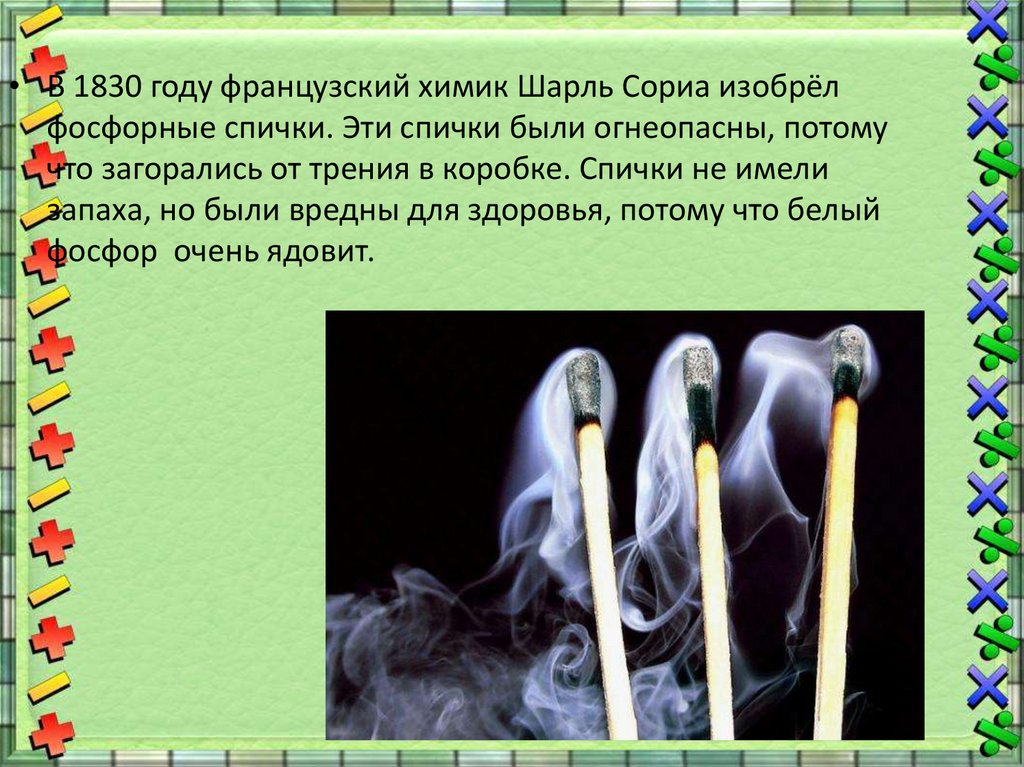 • В 1830 году французский химик Шарль Сориа изобрёлфосфорные спички. Эти спички были огнеопасны, потому