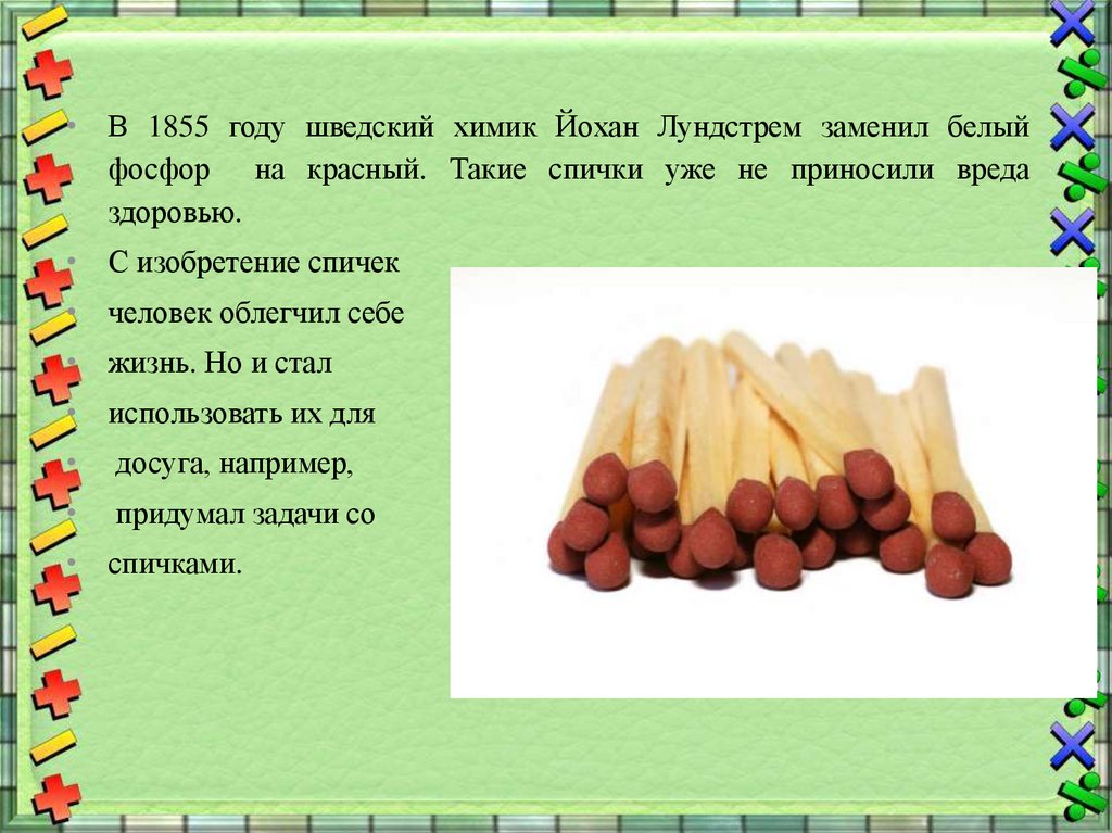 • В 1855 году шведский химик Йохан Лундстрем заменил белыйфосфор на красный. Такие спички уже не приносили вреда
